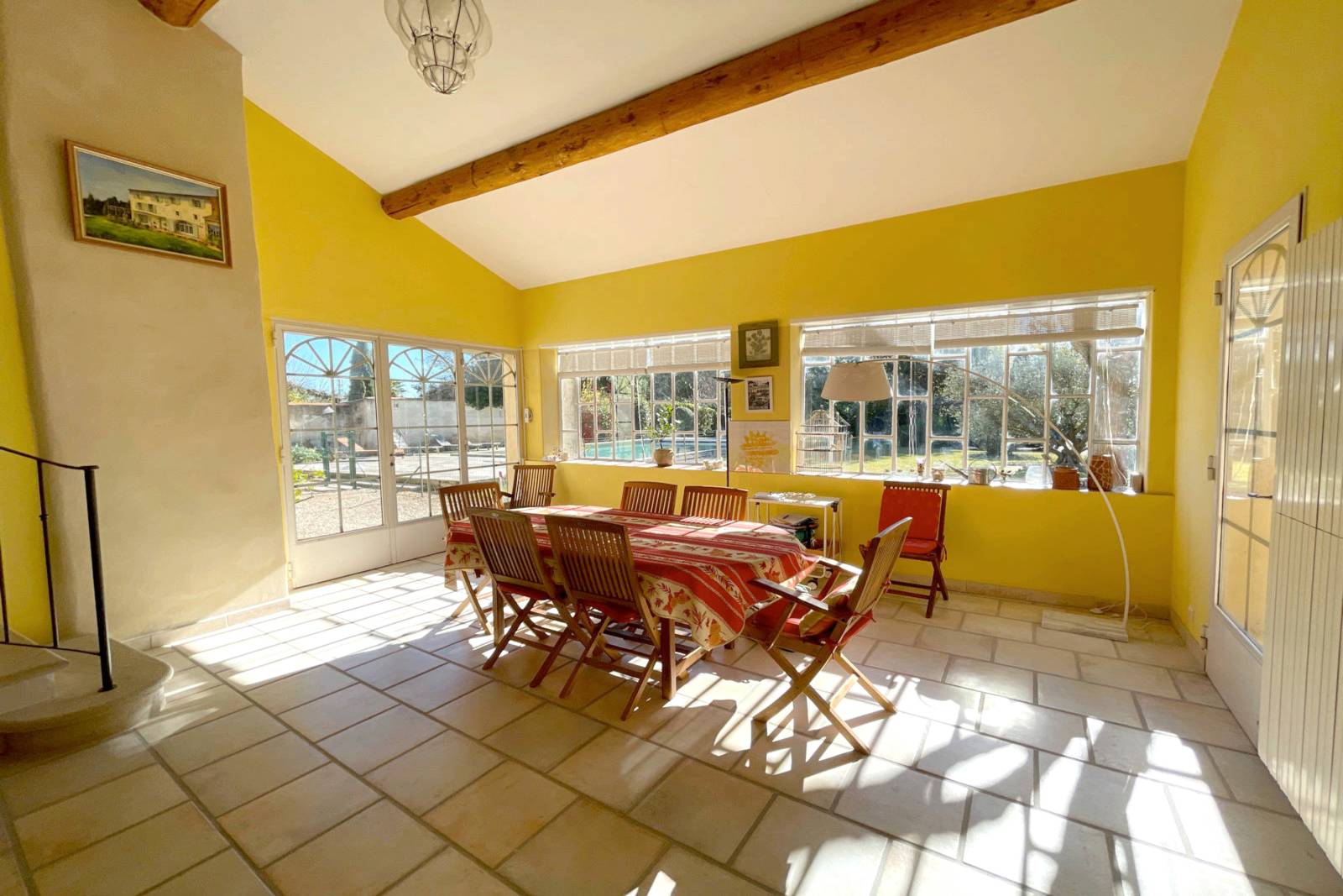 • The former barn has been converted into a veranda, comfortably furnished and equipped with reversible air-conditioning, central heating, a wood-burning stove, a bar and a mezzanine/office, for receptions and family meals in all seasons, overlooking the garden and swimming pool.